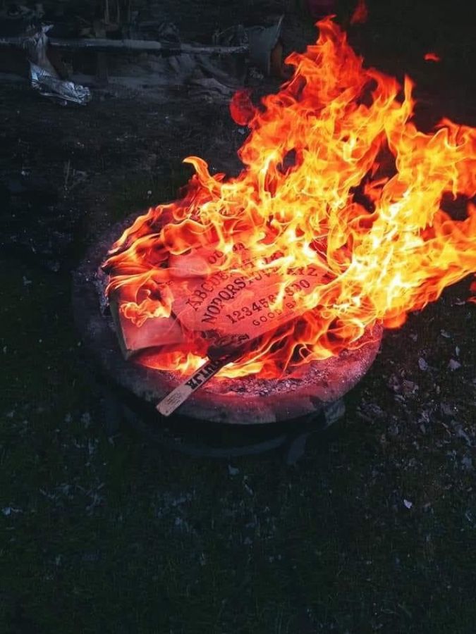 Burning Ouija Board and Witchcraft Paraphernalia